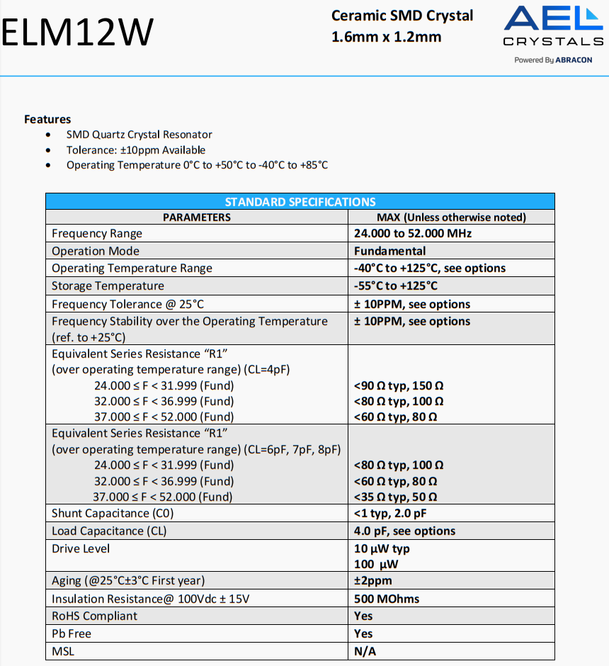 | ELLS-12.000MHz-18-R60-A-4-F-T | AEL Crystals | ELLS | 12 MHz | ±50ppm | ±30ppm | 18 pF |