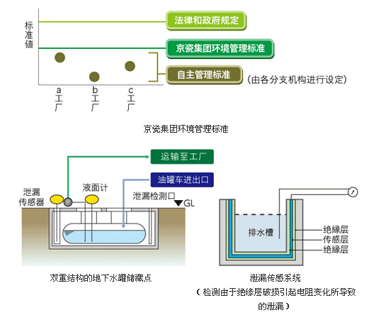 1992年,針對(duì)排氣、排水、土壤、地下水等,京瓷集團(tuán)制定了比法律和政府規(guī)定還要嚴(yán)格的《京瓷集團(tuán)環(huán)境管理標(biāo)準(zhǔn)》.而且,以該環(huán)境管理標(biāo)準(zhǔn)為基礎(chǔ),在各網(wǎng)點(diǎn)設(shè)定了更為嚴(yán)格的自主管理標(biāo)準(zhǔn),定期實(shí)施環(huán)境測(cè)量,貫徹環(huán)境管理.此外,出于防止土壤污染的考慮,制定了《土壤、地下水管理規(guī)程》,通過采用雙重結(jié)構(gòu)的地下罐儲(chǔ)藏點(diǎn)、引進(jìn)泄漏檢測(cè)系統(tǒng)等,致力于及時(shí)發(fā)現(xiàn)泄漏、防止污染擴(kuò)大.