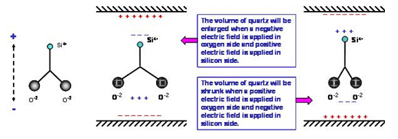 "SG-770SDD 150.0000ML3",石英材料中的二氧化硅分子(SiO2) 在正常狀態(tài)下, 其電偶極是互相平衡的電中性. 在(圖二左)的二氧化硅是以二維空間的簡(jiǎn)化圖形. 當(dāng)我們?cè)诠柙由戏郊把踉酉路椒謩e給予正電場(chǎng)及負(fù)電場(chǎng)時(shí), 空間系統(tǒng)為了維持電位平衡, 兩個(gè)氧原子會(huì)相互排斥, 在氧原子下方形成一個(gè)感應(yīng)正電場(chǎng)區(qū)域, 同時(shí)在硅原子上方產(chǎn)生感應(yīng)負(fù)電場(chǎng)區(qū)域. 相反的情況, 當(dāng)我們?cè)诠柙由戏郊把踉酉路椒謩e給予負(fù)電場(chǎng)及正電場(chǎng)時(shí), 兩個(gè)氧原子會(huì)相互靠近, 氧原子下方產(chǎn)生感應(yīng)負(fù)電場(chǎng),硅原子上方產(chǎn)生感應(yīng)正電場(chǎng). (圖二). 然而, 氧原子的水平位置變化時(shí), 鄰近的另一個(gè)氧原子會(huì)相對(duì)的產(chǎn)生排斥或吸引的力量, 迫使氧原子回到原來的空間位置. 因此, 電場(chǎng)的力量與原子之間的力量會(huì)相互牽動(dòng), 電場(chǎng)的改變與水平方向的形變是形成交互作用狀態(tài). 這個(gè)交互作用會(huì)形成一個(gè)在石英材料耗能最小的振動(dòng)狀態(tài), 祇要由電場(chǎng)持續(xù)給與能量, 石英材料就會(huì)與電場(chǎng)之間維持一個(gè)共振的頻率. 這個(gè)壓電效應(yīng)下氧原子的振幅與電場(chǎng)強(qiáng)度及電場(chǎng)對(duì)二氧化硅的向量角度有相對(duì)應(yīng)的關(guān)系.在實(shí)際的應(yīng)用上, 電場(chǎng)是由鍍?cè)谑⑿酒系慕饘匐姌O產(chǎn)生, 電場(chǎng)與二氧化硅的向量角度則是由石英晶棒的切割角度來決定.