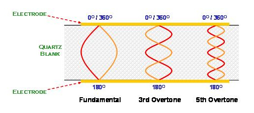 在AT切割角度的石英晶體共振子主要是以厚度剪切振蕩模態存在. 石英晶體在共振時, 除了基本波振蕩之外, 高階的倍頻共振也與基本波振蕩同時存在于石英晶體的電極區域之間. 但是, 由于壓電材料的電極是電氣相位相反的振動環境, 所以, 祇有奇數倍(odd number)的高頻倍頻可以發生, 偶數倍(even number)的倍頻共振在石英晶體共振子是不會存在的(圖十).