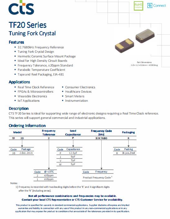 西迪斯晶振TF20,TF203P32K7680R水晶振動(dòng)子,CTS晶振,無源晶振,石英晶體,貼片石英晶振,SMD晶振,無源諧振器,石英晶體諧振器,小尺寸晶振,型號(hào)TF20,編碼TF203P32K7680R是一款金屬面貼片型的音叉晶體,尺寸為2012mm,頻率為32.768KHZ,負(fù)載電容12.5pF,精度30ppm,工作溫度-40°C~+85°C,產(chǎn)品具備高質(zhì)量高性能低損耗的特點(diǎn),非常適合用于實(shí)時(shí)時(shí)鐘參考,FPGAs和微控制器,可穿戴電子,物聯(lián)網(wǎng)應(yīng)用,消費(fèi)電子,醫(yī)療保健設(shè)備,智能電表,儀表等等領(lǐng)域.