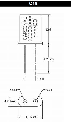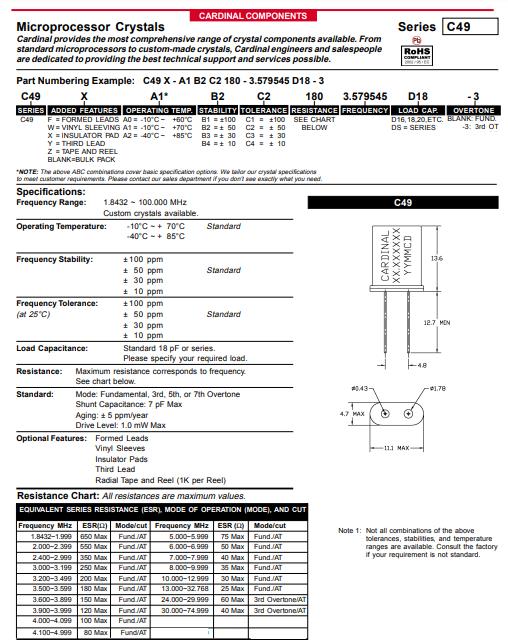 | C49X-A1B2C2-40-34.0D16 | Cardinal晶振 | C49 | 34MHz | 16pF | ±50ppm | 40 Ohm | -20°C ~ 70°C |
