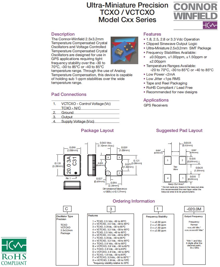 C31-020.0M|TCXO進口溫補晶振|6G基站晶振,ConnorWinfield晶振,C3X有源晶振,C31-020.0M晶振,TCXO進口溫補晶振,3225mm晶振,石英貼片晶振,頻率20MHz,電壓3.3V,工作溫度-30~85°C,頻率穩(wěn)定性0.5ppm,低功耗晶振,低抖動晶振,6G基站晶振,GOS接收器晶振,衛(wèi)星導航系統(tǒng)晶振,智能交通控制器晶振.