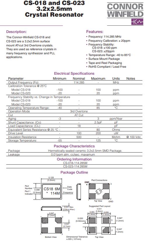 | CS-018-114.285M | Connor-Winfield | CS-018 | 114.285MHz | ±100ppm | ±100ppm | 18pF | 80 Ohm | -40°C ~ 85°C |