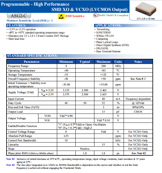 ABRACON晶振,ASG2-C晶振,壓控晶振.2520mm體積的晶振,可以說是目前小型數碼產品的福音,目前超小型的智能手機里面所應用的就是小型的石英晶振,該產品最適用于無線通訊系統,無線局域網,已實現低相位噪聲,低電壓,低消費電流和高穩定度,超小型,質量輕等產品特點,產品本身編帶包裝方式,可對應自動高速貼片機應用,以及高溫回流焊接(產品無鉛對應),為無鉛產品.