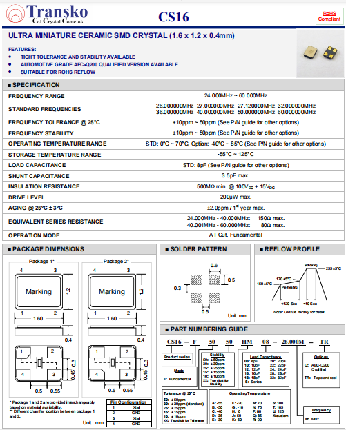 Transko晶振,CS16晶振,無鉛環(huán)保晶體.貼片壓電石英晶體,體積小,焊接可采用自動(dòng)貼片系統(tǒng),產(chǎn)品本身小型,表面貼片晶振,特別適用于有小型化要求的電子數(shù)碼產(chǎn)品市場領(lǐng)域,因產(chǎn)品小型,薄型優(yōu)勢,耐環(huán)境特性,包括耐高溫,耐沖擊性等,在移動(dòng)通信領(lǐng)域得到了廣泛的應(yīng)用,晶振產(chǎn)品本身可發(fā)揮優(yōu)良的電氣特性,滿足無鉛焊接的高溫回流溫度曲線要求.