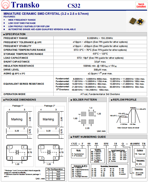 Transko晶振,CS32晶振,貼片無源晶體.貼片晶振本身體積小,超薄型石英晶體諧振器,特別適用于有目前高速發展的高端電子數碼產品,因為晶振本身小型化需求的市場領域,小型,薄型是對應陶瓷諧振器(偏差大)和普通的石英晶體諧振器(偏差小)的中間領域的一種性價比較出色的產品.產品廣泛用于筆記本電腦,無線電話,衛星導航HDD, SSD, USB, Blu-ray等用途,符合無鉛焊接的高溫回流焊曲線特性.