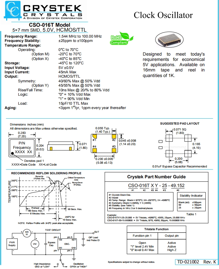 CRYSTEK晶振,CSO-016T晶振,高質(zhì)量有源振蕩器.貼片式石英晶體振蕩器,低電壓啟動(dòng)功率,并且有多種電壓供選擇,比如有1.8V,2.5V,3.3V,3.8V,5V等,產(chǎn)品被廣泛應(yīng)用于,平板筆記本,GPS系統(tǒng),光纖通道,千兆以太網(wǎng),串行ATA,串行連接SCSI,PCI-Express的SDH/SONET發(fā)射基站等領(lǐng)域.符合RoHS/無鉛.