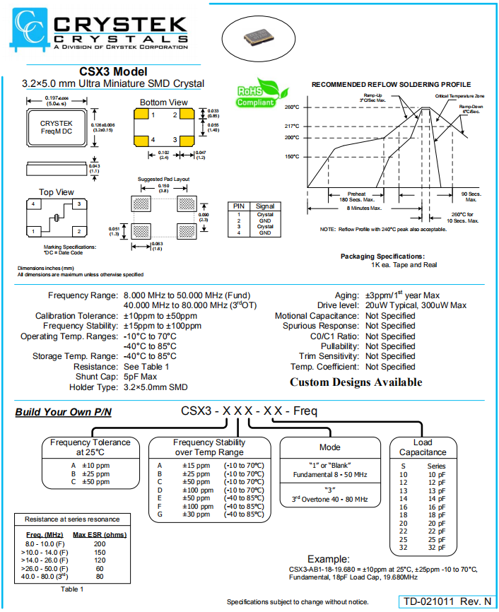 CRYSTEK晶振,CSX3晶振,高性能石英晶體.小型表面貼片晶振型,是標(biāo)準(zhǔn)的石英晶體諧振器,適用于寬溫范圍的電子數(shù)碼產(chǎn)品,家電電器及MP3,MP4,播放器,單片機(jī)等領(lǐng)域.可對(duì)應(yīng)8.000MHz以上的頻率,在電子數(shù)碼產(chǎn)品,以及家電相關(guān)電器領(lǐng)域里面發(fā)揮優(yōu)良的電氣特性,滿足無鉛焊接的回流溫度曲線要求.