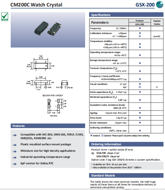 Golledge晶振,GSX-200晶振,無源環保晶振.貼片晶振本身體積小,超薄型石英晶體諧振器,特別適用于有目前高速發展的高端電子數碼產品,因為晶振本身小型化需求的市場領域,小型?薄型是對應陶瓷諧振器(偏差大)和普通的石英晶體諧振器(偏差小)的中間領域的一種性價比較出色的產品.產品廣泛用于筆記本電腦,無線電話,衛星導航HDD,SSD,USB,Blu-ray等用途,符合無鉛焊接的高溫回流焊曲線特性.