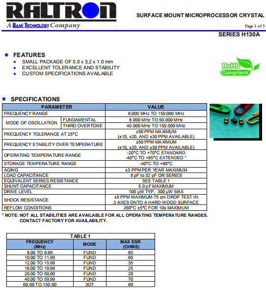 Raltron晶振,H130A晶振,石英晶體諧振器.小型石英貼片5032晶振,外觀尺寸具有薄型表面貼片型石英晶體諧振器,特別適用于有小型化要求的市場領域,比如智能手機,無線藍牙,平板電腦等電子數碼產品.晶振本身超小型,薄型,重量輕,晶體具有優良的耐環境特性,如耐熱性,耐沖擊性,在辦公自動化,家電相關電器領域及Bluetooth,WirelessLAN等短距離無線通信領域可發揮優良的電氣特性,滿足無鉛焊接的回流溫度曲線要求.