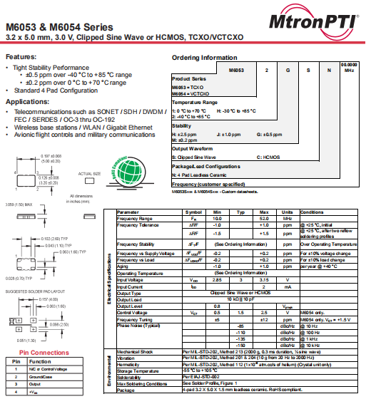 MTRONPTI晶振,M6053晶振,TCXO晶體振蕩器.5032mm體積的石英晶體振蕩器,有源晶振,該產(chǎn)品可驅(qū)動(dòng)2.5V的溫補(bǔ)晶振,壓控晶振,VC-TCXO晶體振蕩器產(chǎn)品,電源電壓的低電耗型,編帶包裝方式,可對(duì)應(yīng)自動(dòng)高速貼片機(jī)自動(dòng)焊接,及IR回流焊接(無(wú)鉛對(duì)應(yīng)),為無(wú)鉛產(chǎn)品,超小型,質(zhì)地輕.產(chǎn)品被廣泛應(yīng)用到集成電路,程控交換系統(tǒng),無(wú)線發(fā)射基站.