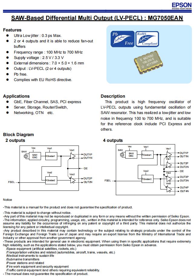 | X1M0004110014 | MG7050EAN | 100.000000 MHz | 7.00 x 5.00 x 1.60 mm | LV-PECL | 2.970 to 3.630 V |