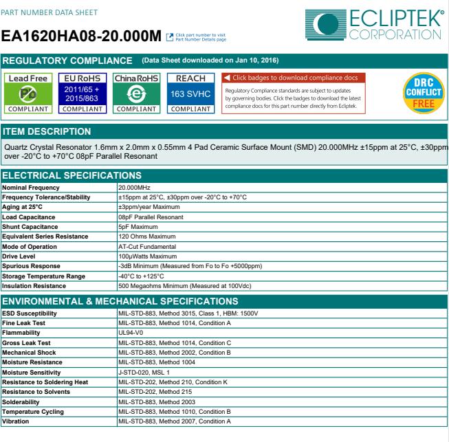 ECLIPTEK晶振,EA1620石英晶振,EA1620HA08-20.000M晶振,貼片晶振本身體積小,超薄型石英晶體振蕩器,特別適用于有目前高速發展的高端電子數碼產品,因為晶振本身小型化需求的市場領域,小型,薄型是對應陶瓷振蕩器(偏差大)和普通的石英晶體振蕩器(偏差小)的中間領域的一種性價比較出色的產品.產品廣泛用于筆記本電腦,無線電話,衛星導航SSD,USB,Blu-ray等用途,符合無鉛焊接的高溫回流焊曲線特性.