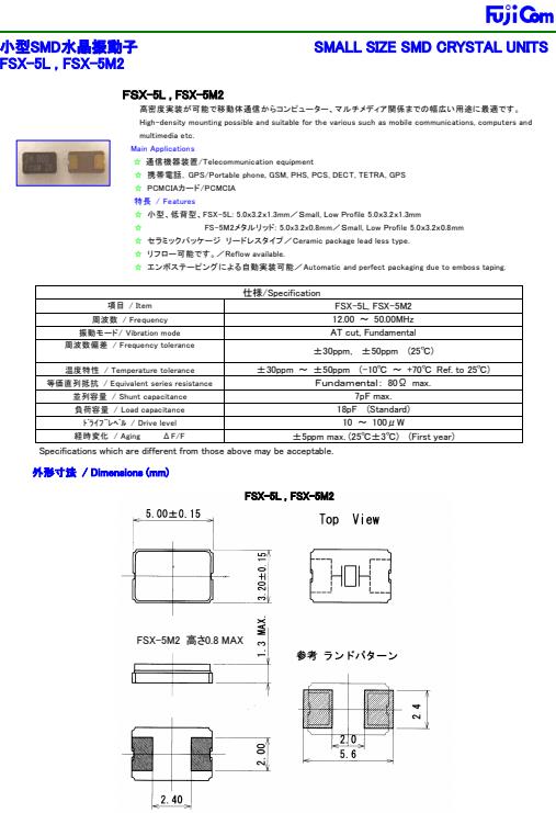 進口富士晶振,FSX-5L晶振,FSX-5M2石英晶振,GSM專用晶振,小型表面貼片晶振型,是標(biāo)準(zhǔn)的石英晶體振蕩器,適用于寬溫范圍的電子數(shù)碼產(chǎn)品,家電電器及MP3,MP4,播放器,單片機等領(lǐng)域.可對應(yīng)8.000MHz以上的頻率,在電子數(shù)碼產(chǎn)品,以及家電相關(guān)電器領(lǐng)域里面發(fā)揮優(yōu)良的電氣特性,滿足無鉛焊接的回流溫度曲線要求.