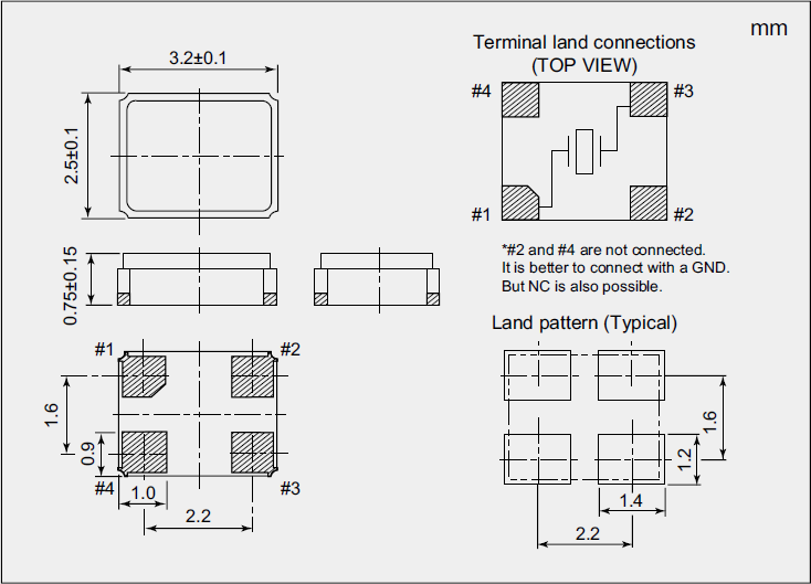 NDK汽車電子晶振,NX3225GA-16.9344M-STD-CRG-2,16.9344MHz,3225mm,±30ppm 尺寸圖