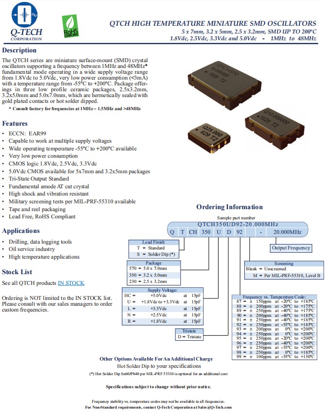 QTCH230LD92-32.000MHz|3225mm高溫應用晶振|Q-Tech美國晶振,型號QTCH230,編碼QTCH230LD92-32.000MHz,是美國Q-Tech晶振公司旗下的一款微型表面貼裝(SMD)晶體振蕩器,支持頻率在1MHz至48MHz之間*基模,工作在1.8Vdc至5.0Vdc的寬電源電壓范圍內,功耗極低(<3mA),溫度范圍為-55ºC至+200ºC,尺寸3225mm,是高溫應用晶振,可用于鉆井、數據測井工具,石油服務行業等領域.