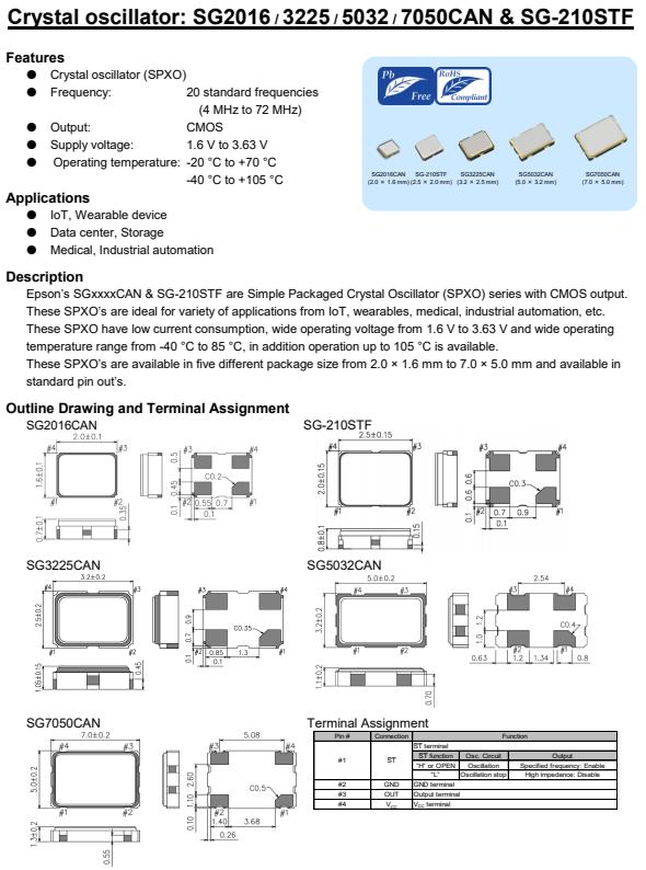 愛普生的SGxxxxCAN和SG-210STF是具有CMOS輸出的簡單封裝晶體振蕩器(SPXO)系列。這些SPXO是物聯(lián)網(wǎng)、可穿戴設(shè)備、醫(yī)療、工業(yè)自動化等各種應(yīng)用的理想選擇。這些SPXO有源晶振具有低電流消耗,寬工作電壓從1.6 V到3.63 V,寬工作溫度范圍從-40°C到85°C,另外可操作到105°C。這些SPXO的可在五種不同的包裝尺寸從2.0 × 1.6毫米到7.0 × 5.0毫米,可在標(biāo)準(zhǔn)針的。