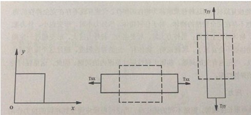 如圖2.2.1(a)所示的小方片,當(dāng)它受到x方向的應(yīng)力作用時(shí),除在x方向產(chǎn)生伸長(zhǎng)外,同時(shí)在y方向也產(chǎn)生收縮,如圖2.2.1(b)所示。同樣,當(dāng)小方片受到y(tǒng)方向的應(yīng)力作用時(shí),除了在y方向產(chǎn)生伸長(zhǎng)外,同時(shí)在x方向也產(chǎn)生收縮