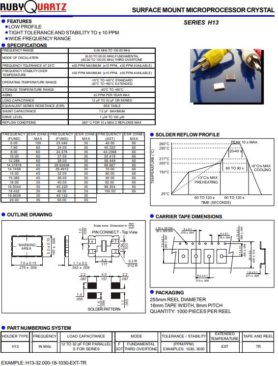 Rubyquartz晶體,H13無(wú)源諧振器,H13-12.000-18-1030-EXT-TR貼片晶振,貼片晶振本身體積小,超薄型石英晶體振蕩器,特別適用于有目前高速發(fā)展的高端電子數(shù)碼產(chǎn)品,因?yàn)榫д癖旧硇⌒突枨蟮氖袌?chǎng)領(lǐng)域,小型,薄型是對(duì)應(yīng)陶瓷振蕩器(偏差大)和普通的石英晶體振蕩器(偏差小)的中間領(lǐng)域的一種性?xún)r(jià)比較出色的產(chǎn)品.產(chǎn)品廣泛用于筆記本電腦,無(wú)線(xiàn)電話(huà),衛(wèi)星導(dǎo)航SSD,USB,Blu-ray等用途,符合無(wú)鉛焊接的高溫回流焊曲線(xiàn)特性.