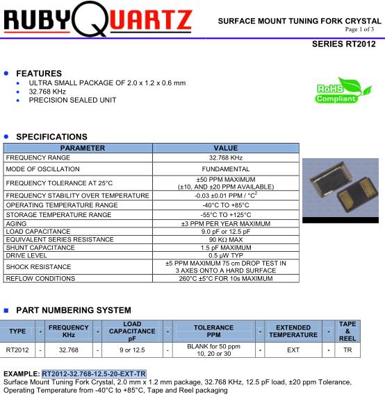 RT2012無源晶體,盧柏歐美晶體,RT2012-32.768-12.5-20-EXT-TR超小型晶振,32.768K時鐘晶體具有小型,薄型,輕型的貼片晶振表面音叉型晶體振蕩器,產品具有優良的耐熱性,耐環境特性,可發揮晶振優良的電氣特性,符合RoHS規定,滿足無鉛焊接的高溫回流溫度曲線要求,金屬外殼的封裝使得產品在封裝時能發揮比陶瓷振蕩器外殼更好的耐沖擊性.