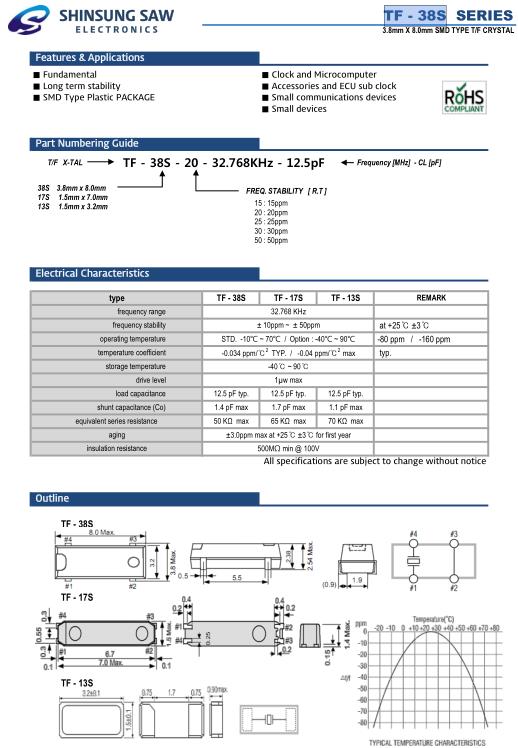 韓國新松晶振,TF-38S貼片晶振,TF-38S-25-32.768KHz-12.5pF晶振,32.768K時鐘晶體具有小型,薄型,輕型的貼片晶振表面音叉型晶體振蕩器,產品具有優良的耐熱性,耐環境特性,可發揮晶振優良的電氣特性,符合RoHS規定,滿足無鉛焊接的高溫回流溫度曲線要求,金屬外殼的封裝使得產品在封裝時能發揮比陶瓷振蕩器外殼更好的耐沖擊性.