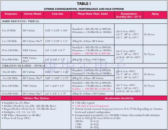 新型Citrine系列晶體振蕩器專為在要求靜態和動態條件下具有低相位噪聲性能的最苛刻應用提供廣泛的貼片晶振產品.黃水晶振蕩器可以配置為1~650MHz之間的任何固定頻率.黃水晶系列有八種配置.低頻HF振蕩器和VHF振蕩器均可使用,也可以不使用隔振系統.而且,“PLUS”系列還提供HF和VHFCitrines,當應用需要額外的功能時,可添加乘法器,分頻器,放大器,濾波器和雙輸出. Citrine系列具有多種包裝配置,可以根據頻率,所需的選件,性能規格和其他應用注意事項進行選擇.有關標準Citrine配置和性能選項,請參見表1. 黃水晶靜態相位噪聲性能