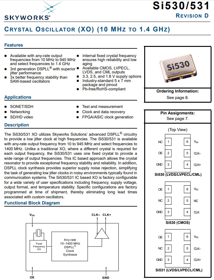 Si531 XO支持多種選項,包括頻率、溫度穩(wěn)定性、輸出格式和VDD。 裝運時,Si531有源晶振中已編程設定了具體的器件配置。配置可以是 使用下面的零件號配置表指定。Skyworks解決方案提供了一個基于網(wǎng)絡瀏覽器的零件號配置實用程序來簡化此過程。Si531 XO系列采用符合RoHS標準的工業(yè)標準6- 襯墊,小體積7.0x5.0mm包裝。Si531系列支持LVPECL、LVDS和的備用OE引腳排列(引腳#1) CML輸出格式。531AC156M250DG應用于時鐘和數(shù)據(jù)恢復晶振