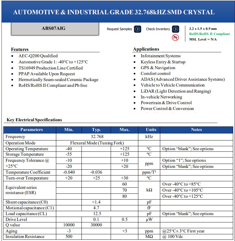 Abracon晶振ABS07AIG是一種高溫石英晶體,小體積尺寸3.2x1.5mm兩腳貼片晶振,32.768K晶振,石英晶體諧振器,通過AEC-Q200認證,并通過TSI6949生產線認證。該器件具有-40°C至+125°C的寬工作溫度范圍,是極端環境下商業或工業應用的完美解決方案。憑借超薄的外形,無源晶振ABS07AIG可以在空間受限的設計中實現,如可穿戴設備或車輛的信息娛樂系統。這種石英晶體采用密封的陶瓷封裝,在導航,智能手機,無線通信,車載晶振等應用中具有長期可靠性。與其ABS07系列類似,automotive系列可以執行低至10ppm的嚴格頻率穩定度,以確保其時間管理精確無誤。雖然ABS07AIG系列可以執行額外的要求,但它針對低功耗進行了優化,以延長電池壽命,因此非常適合各種應用。汽車導航專用石英晶體ABS07AIG-32.768KHZ-D-T