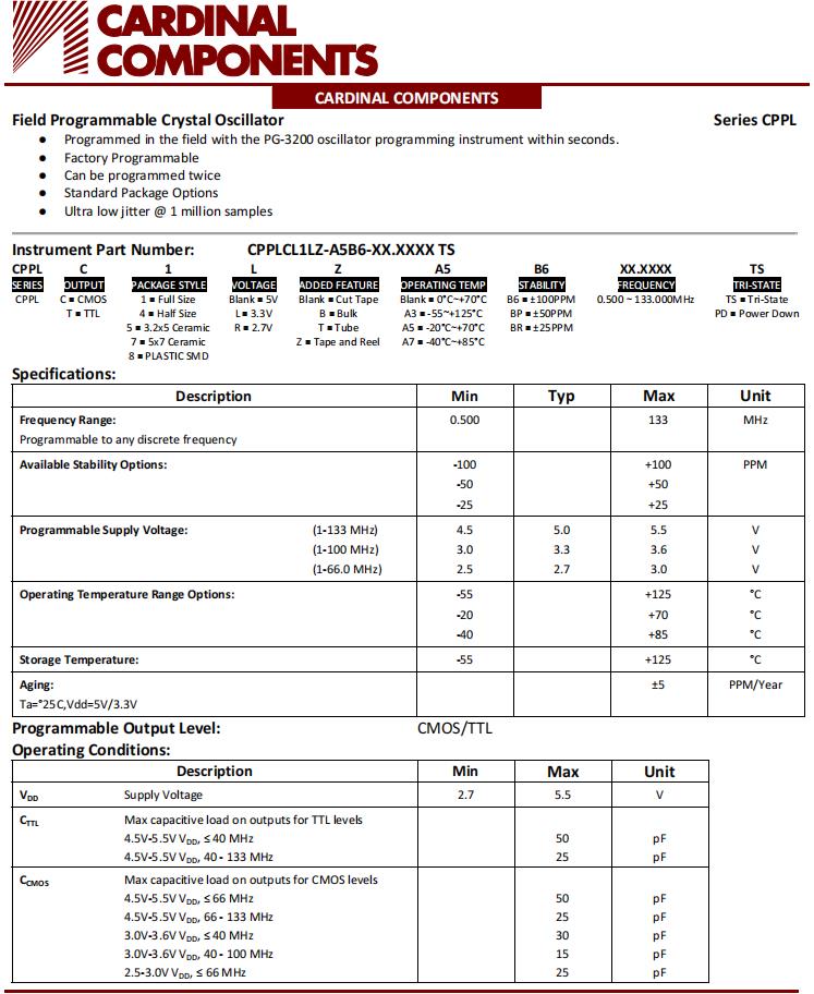 Cardinal低抖動的XO振蕩器編碼CPPLC5-A7BR-25.0TS常用于高速通信和基站,SPXO振蕩器產(chǎn)品特點: