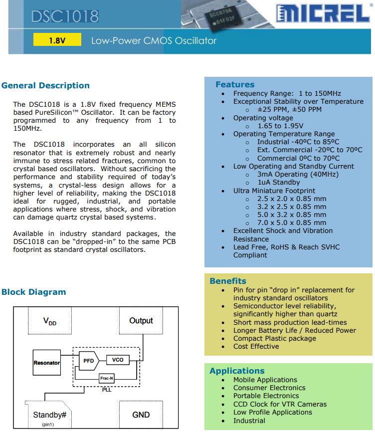 編碼DSC1018DE1-125.0000T,DSC1018是一款1.8V定頻MEMS基于PureSilicon™振蕩器可以是工廠編程到任意頻率從1到150mhz。DSC1018采用全硅諧振器是非常堅固和接近對壓力相關骨折免疫,常見的有源晶體振蕩器。在不犧牲性能和穩定性要求今天系統,一個無晶體的設計允許更高水平的可靠性,使DSC1018理想的堅固,工業和便攜式應用于應力,沖擊和振動可以破壞石英晶體系統。可在行業標準軟件包中使用DSC1018可以“插入”到同一PCB上作為標準晶體振蕩器的足跡。