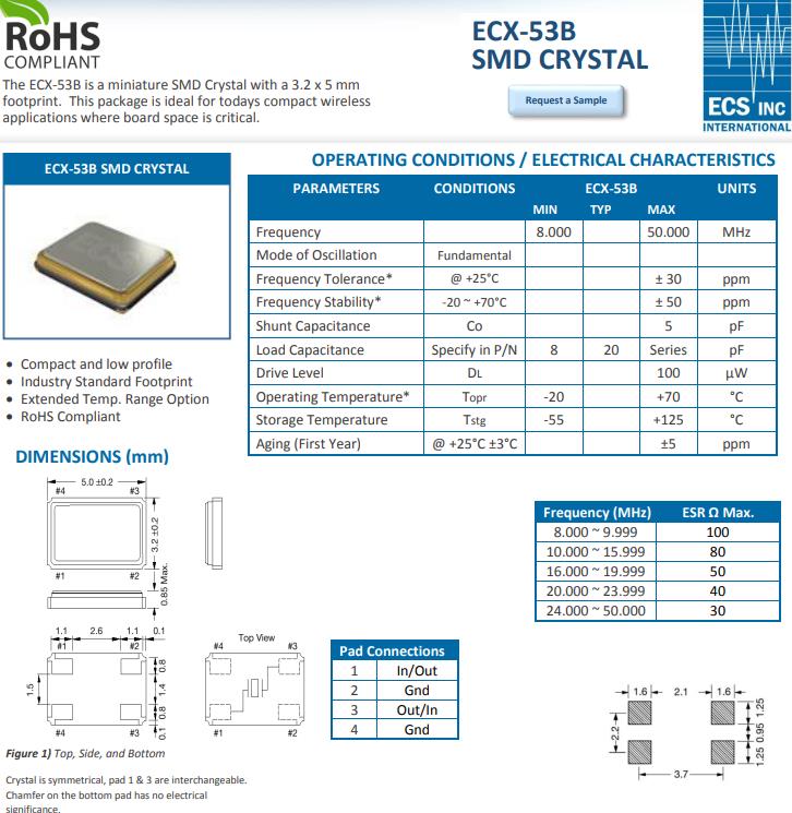 編碼ECS-120-8-30B-CKM,ECX-53B是一個5.0x 3.2MM的微型SMD晶振足跡。這個包是理想的今天緊湊型無線電路板空間非常重要的應用程序。緊湊、低調行業標準足跡,擴展溫度范圍選項,符合RoHS標準.