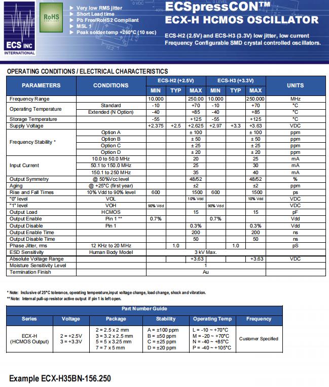 ECS公司利用自身獨特的創新能力開發編碼ECX-H27BN-30.000,尺寸為7050MM,ECS-H2(2.5V)和ECS-H3(3.3V)低抖動、低電流頻率可配置的SMD晶體控制振蕩器,有源晶振,非常低的均方根抖動,很短的前置時間,自由/RoHS2兼容XMSL1X峰值焊料溫度+260°C(10秒),產品具備高性能高質量低電壓低抖動的特點,比較適合用于儀器設備,投影機,醫療產品,藍牙模塊等領域.