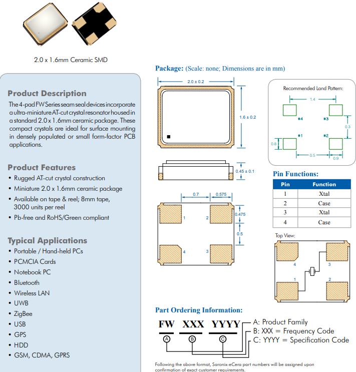 4-pad FW系列接縫密封裝置超微型at切割石英晶體諧振器一個標準的2.0 x 1.6毫米陶瓷封裝。這些致密晶體是表面安裝的理想選擇在人口密集或小形狀因素PCB應(yīng)用程序。