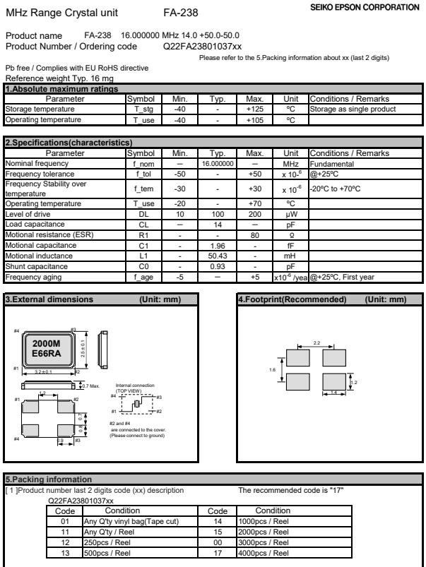| Q22FA2380098000 | 3.2 x 2.5 x 0.7mm | FA-238 | 00.000000 MHz | 22 pF | +/-50 ppm | +/-30 ppm | -20 to +70 °C |
