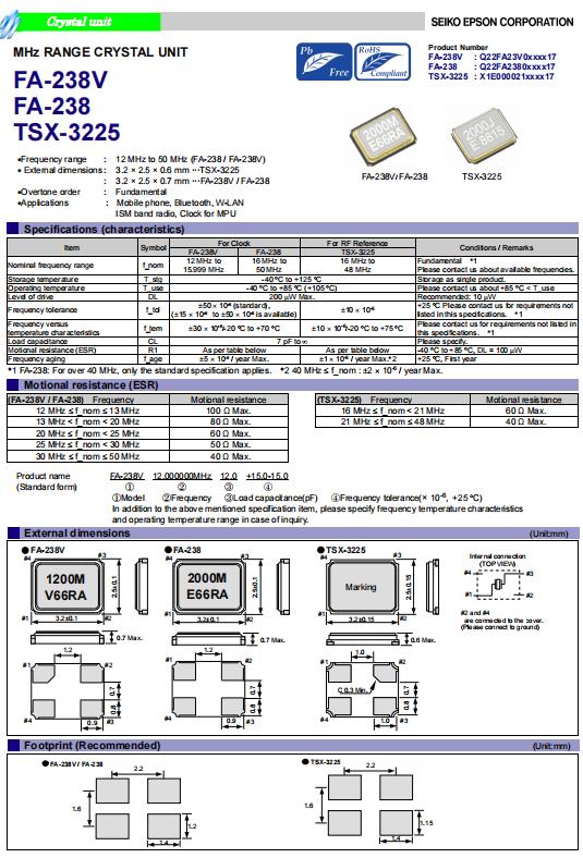 | Q22FA2380181516 | 3.2 x 2.5 x 0.7mm | FA-238 | 24.000000 MHz | 10 pF | +/-50 ppm | +/-50 ppm | -40 to +105 °C | ≤ 60 Ω |