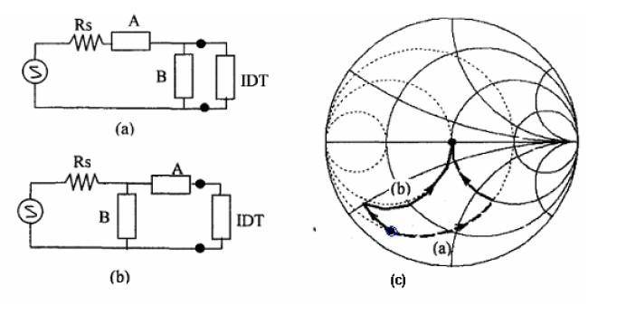 (4)LC匹配網(wǎng)絡(luò)設(shè)計得當,可以起到LC濾波器的作用,提高遠端帶外抑制。 SAW濾波器的匹配不同于其他濾波器的匹配,針對不同結(jié)構(gòu)的SAW濾波器其匹配目標不同。對于高損耗聲表面濾波器濾波器并不需要與外部電路完全的共軛理想匹配,因為在較大的聲輻射條件下,改進理想匹配雖然可以實現(xiàn)低損耗,但卻是以增加幅度和相位波動為代價的。這些器件通常有意使器件在一定程度上失配。對于中等損耗的SPUDT濾波器,其匹配也不完全是理想電匹配。對于1~4dB的低損耗SAW濾波器則要求盡量理想電匹配以取得最小損耗。 為了使聲表面波器件應用簡單,濾波器的輸入輸出端一般采用二元件進行匹配。對不同的SAW濾波器S參數(shù),匹配網(wǎng)絡(luò)不同,需要根據(jù)Smith圓圖,選取合適的匹配網(wǎng)絡(luò)結(jié)構(gòu)。在Smith圓圖中,經(jīng)匹配從起點到目的位置點經(jīng)過的曲線長度越短,匹配后頻響特性越好。如圖1(c)中兩條曲線分別對應于圖1(a)、(b)的匹配電路網(wǎng)絡(luò)。