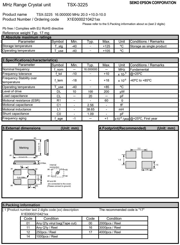 | X1E000021057816 | 3.2 x 2.5 x 0.6mm | TSX-3225 | 16.000000 MHz | 8 pF | +/-10 ppm | +/-18 ppm | -40 to +85 °C |