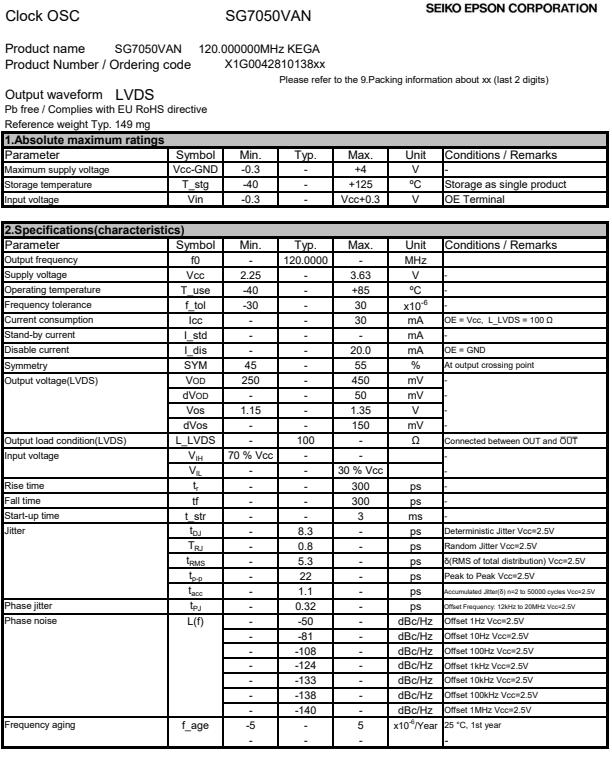 | X1G004281013800 | SG7050VAN | 120.000000 MHz | 7.00 x 5.00 x 1.60 mm | LVDS | 2.250 to 3.630 V | -40 to 85 °C |