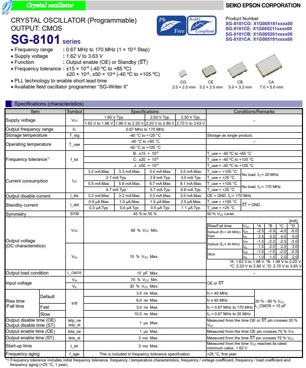 | X1G005191001300 | SG-8101CA | 100.000000 MHz | 7.00 x 5.00 x 1.40 mm | CMOS | 1.620 to 3.630 V | -40 to 85 °C |