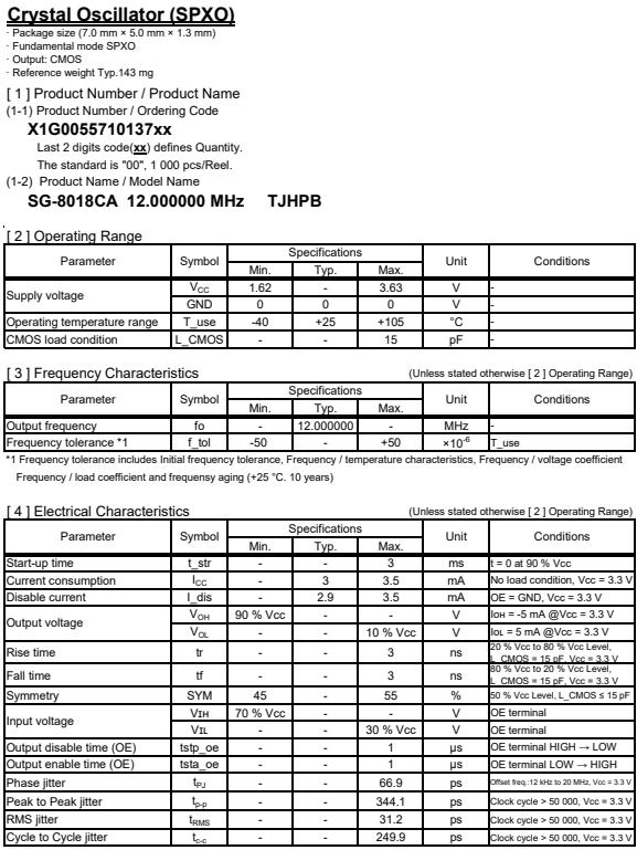 | X1G005571013700 | SG-8018CA | 12.000000 MHz | 7.00 x 5.00 x 1.40 mm | CMOS | 1.620 to 3.630 V | -40 to 105 °C |