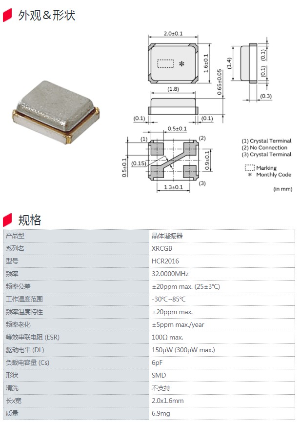 | XRCGB32M000F3M00R0 | HCR2016 | 32.0000MHz | ±30ppm max. (25±3℃) | 消費級 |