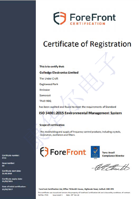 更多>>英國Golledge Crystal原廠的ISO14001環境質量證書